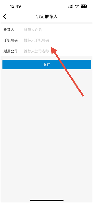4、在绑定推荐人页面,依次输入推荐人信息,点击保存按钮,即可完成绑定操作。