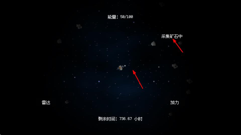 1、操控飞船在太空场景移动,发现“采集矿石中”标识的矿石堆,靠近进行采集,获取资源,同时注意能量消耗。