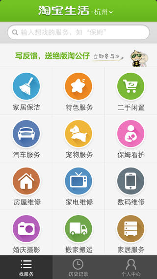 淘宝生活是由淘宝网打造的生活服务平台,覆盖全国大中城市,能迅速帮您找到周边的生活服务信息:家政保洁、保姆看护、搬家、维修、汽车服务、宠物服务、婚庆摄影、特色服务、二手闲置等。