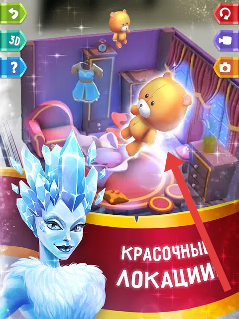 3、在3D场景,操控角色与箭头指向的玩具熊互动,探索“КРАСОЧНЫЕ-ЛОКАЦИИ”,完成场景内的互动任务。