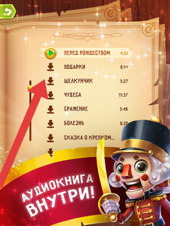 2、进入故事列表,按箭头选“ПЕРЕД-РОЖДЕСТВОМ”等章节,开启“АУДИОКНИГА-ВНУТРИ!”音频故事体验。