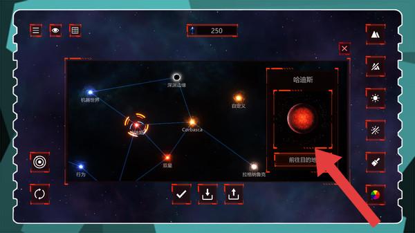 3、展示了宇宙地图界面,包含“哈迪斯”等星球及星际航行相关交互(如“前往目的地”),呈现出模拟宇宙探索、星球互动等玩法的场景。