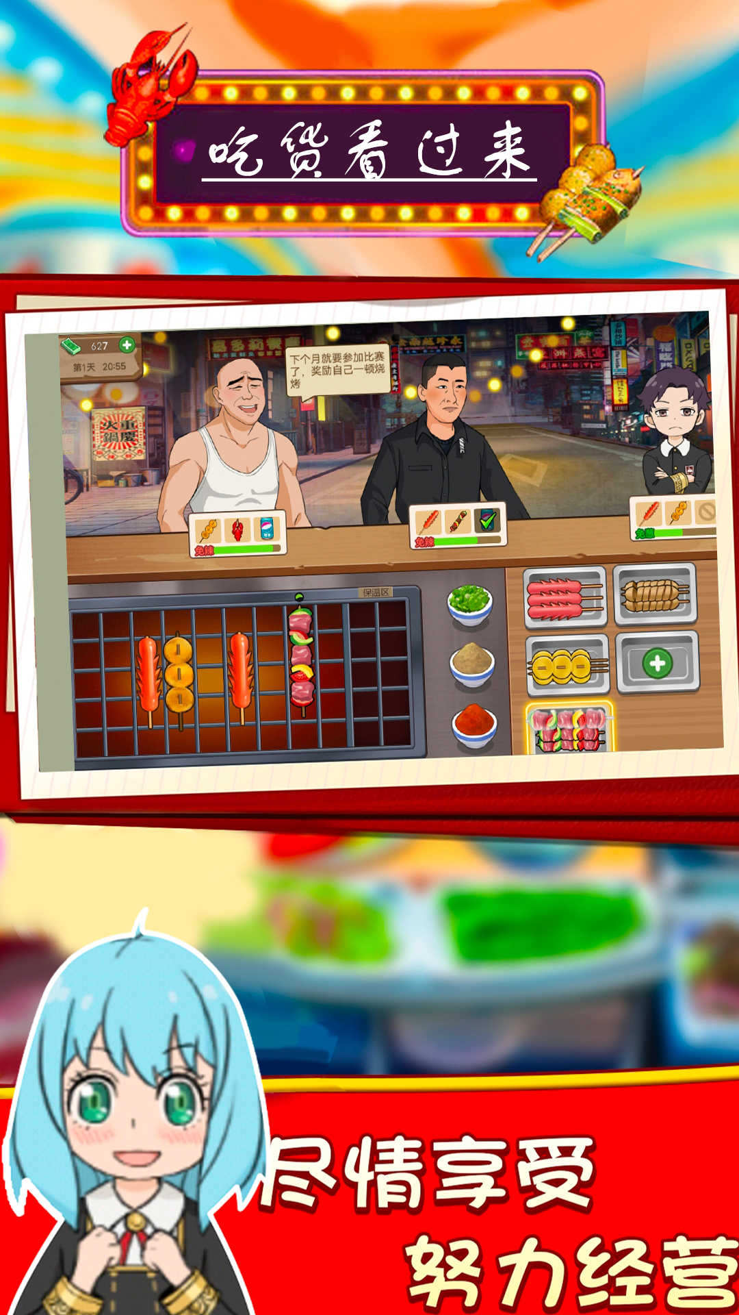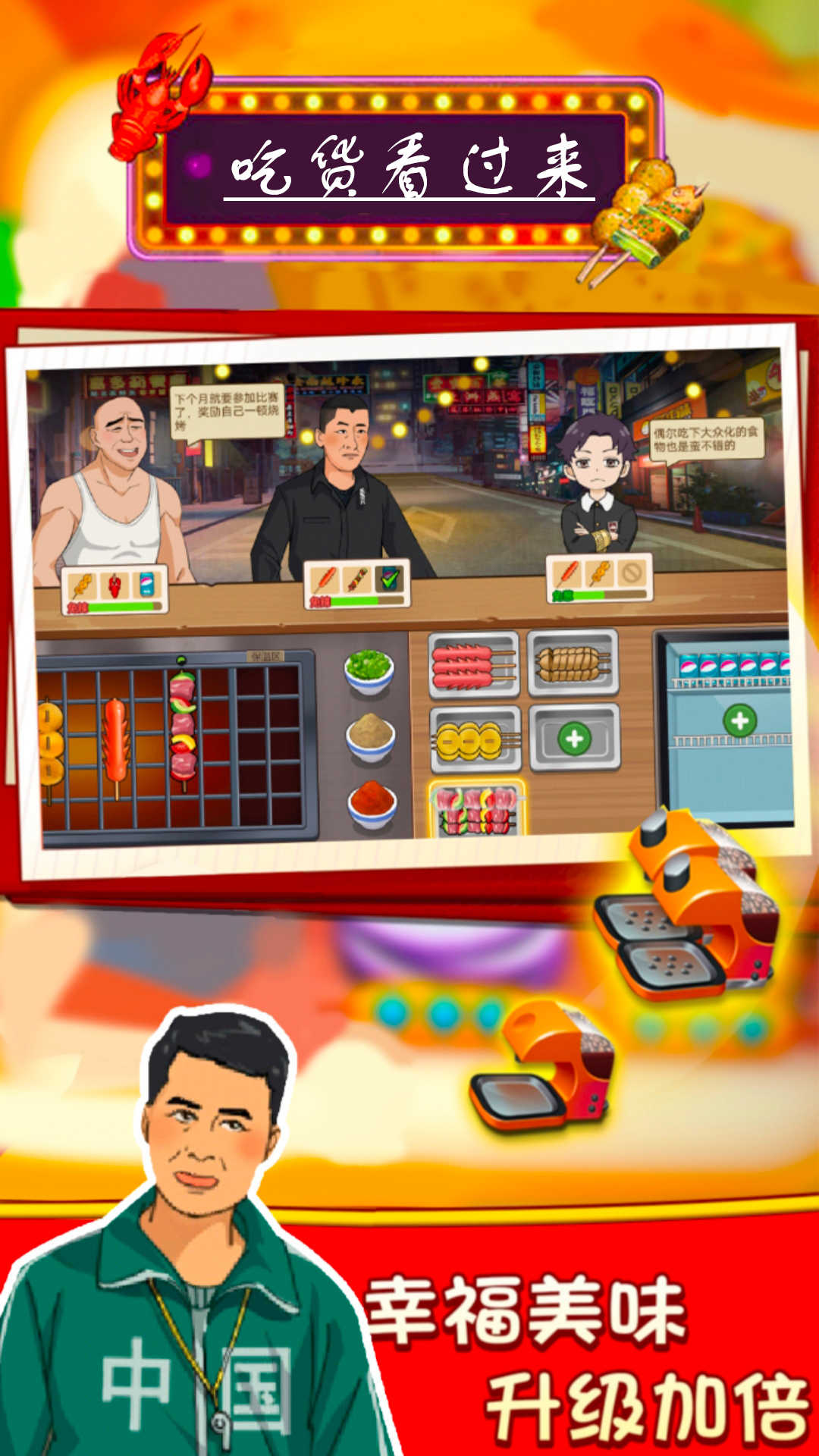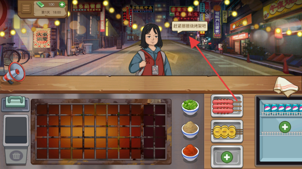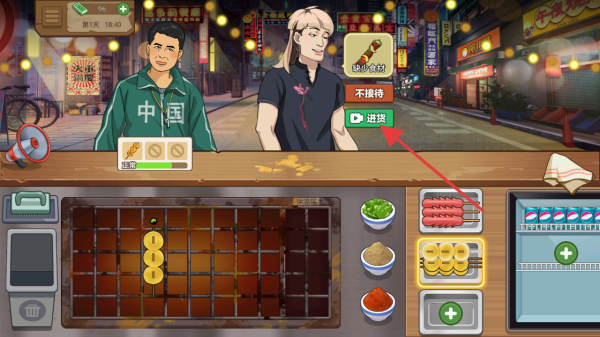 3、遇新顾客,看需求(如“进究”),选食材(烤串)烤制,注意顾客“不接待”条件,合理经营,升级摊位、解锁食材,扩大生意。