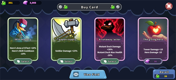 1、在【Buy Card】界面,选合适卡牌(如提升英雄、士兵等属性),消耗绿宝石购买,增强战力。