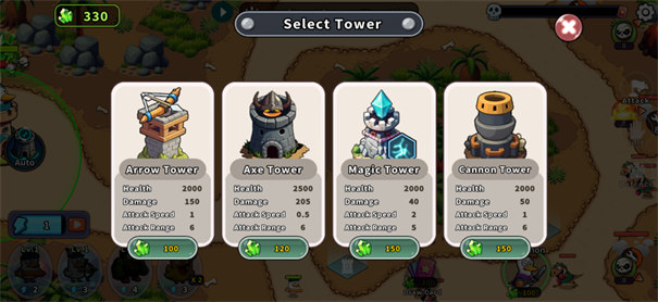 2、进入【Select Tower】,依据关卡,选【Arrow Tower】等防御塔,消耗金币建造,布置防线。