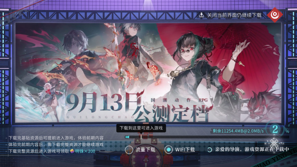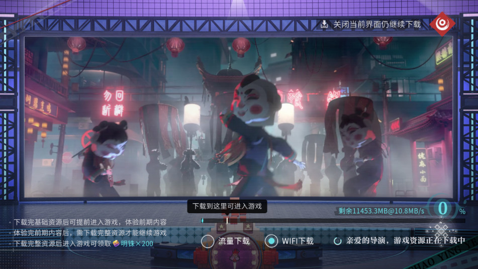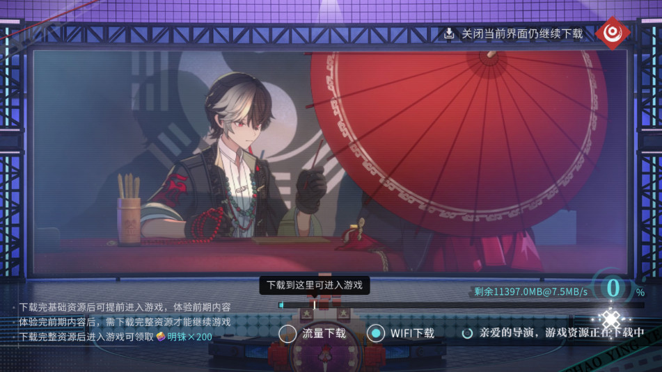 1、下载选择(通用),选“WIFI下载”省流量;等基础资源下完(到进度条标识),先进游戏领“明铢×200”福利。
