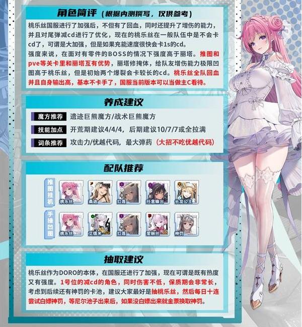 1、核心角色定位:桃乐丝兼具全队回血、增伤与减CD优化,为1号位减CD核心,低练期适配性强,定位C级养成核心;节奏榜中红莲居T0(AOE输出)、丽塔列T1(增伤辅助)。