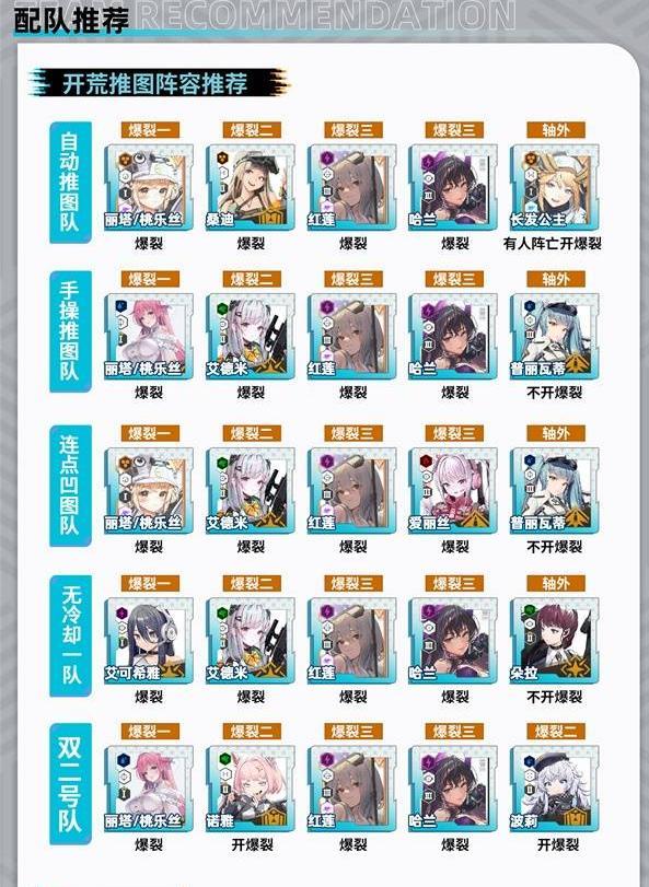 2、配队分自动推图(丽塔/桃乐丝+桑迪+红莲+哈兰+长安公主)、手操推图(丽塔/桃乐丝+艾德米+红莲+哈兰+普丽瓦蒂)等阵容。