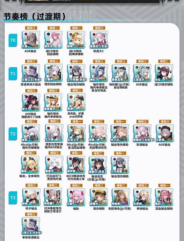 2、强度梯度参考:过渡期节奏榜设T0-T3分级,T0含红莲(AOE)、桃乐丝(减CD+回血)等,T1覆盖丽塔(增伤)、艾德文等辅助,T2-T3为功能特化角色。