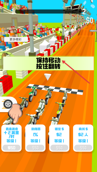 1、按【保持移动 按住翻转】提示,选摩托(如最速油鱼+2英里/时 ),开始比赛。