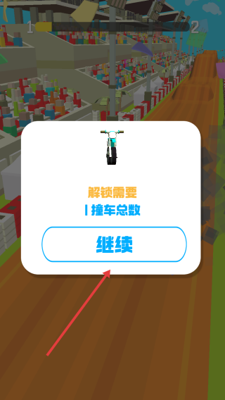 3、撞车后,点【继续】,积累撞车数,解锁新摩托,继续挑战。