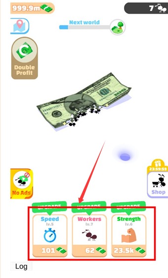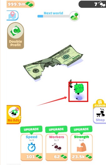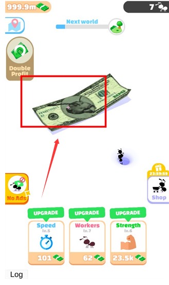 1、首先进入游戏,可以看到蚂蚁需要搬运的物品,也可能是食物,这次的是钞票。
