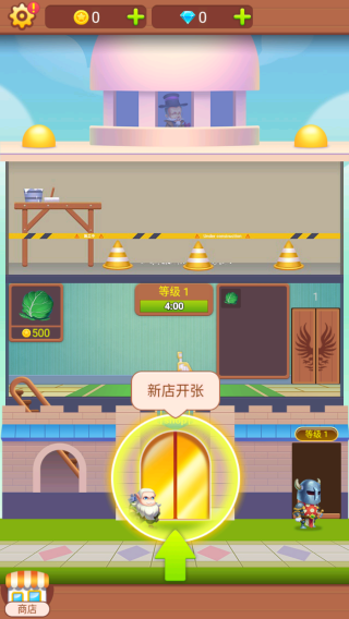 1、呈现游戏中“新店开张”的玩法环节,玩家可通过此类操作拓展经营内容,画面中有金币、钻石等游戏货币显示,还有建筑、角色等元素。