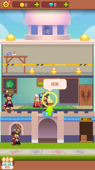 2、呈现游戏中“结账”的经营玩法环节,画面中有角色、建筑及金币、钻石等货币显示,玩家可在此类操作中推进店铺经营流程。