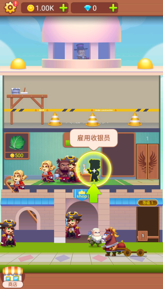 3、呈现“雇用收银员”的玩法环节,画面有金币(1.00K)、钻石等货币显示,还有角色、建筑等元素,玩家可通过雇用员工推进店铺经营。