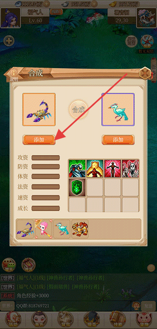 1、进入游戏,先熟悉【合成】系统,选蝎子+鸟类宠物尝试合成,消耗资源获取新宠物,提升养成进度。