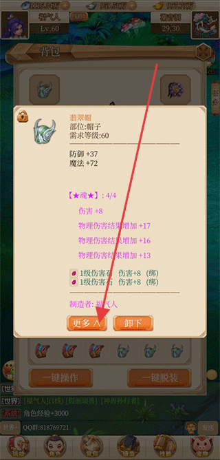 3、打开【背包】,装备“悲翠帽”等60级装备,利用“一键操作”快速穿戴,依据词条(物理伤害结果)适配角色。