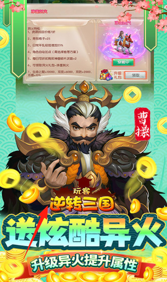 1、选武将(曹)(红箭头),完成“聚宝盆”任务,领取奖励(金币元宝),升级“炫酷异火”,提升属性。