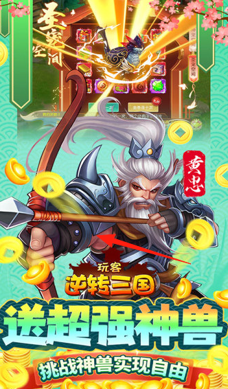 3、挑战神兽(红箭头),操控黄忠,搭配“超强神兽”,通关“圣宠空间”,获取养成资源,实现神兽自由,推进战力。