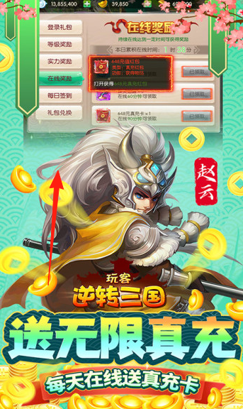 2、进入福利界面(红箭头),领取“在线奖励”(真充卡),通过“等级实力”奖励,强化赵云等武将,激活阵容。