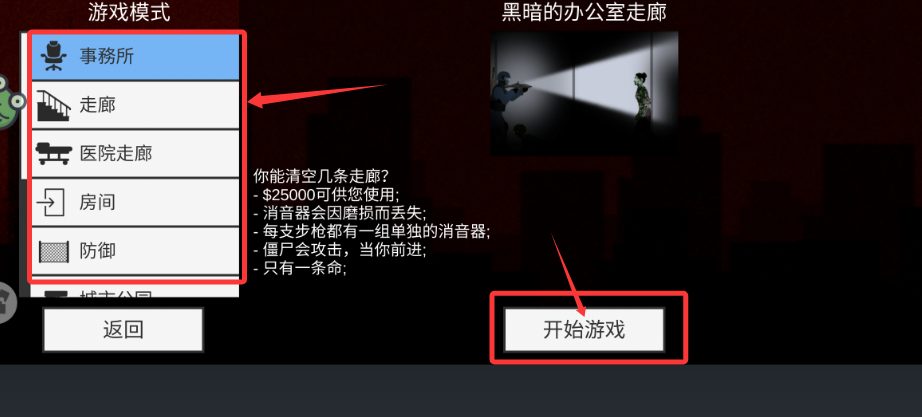 1、游戏提供多种模式,可根据喜好选择挑战,开启惊险刺激的丧尸猎杀之旅。
