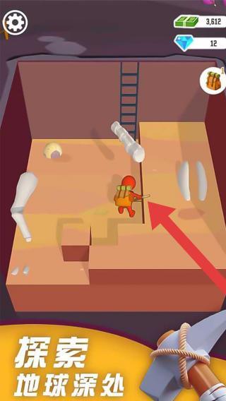 3、呈现角色在地下场景探索,有骨骼化石等元素,结合“探索地球深处”文字,玩家可体验考古挖掘、收集化石等玩法,经营发展相关考古事业。