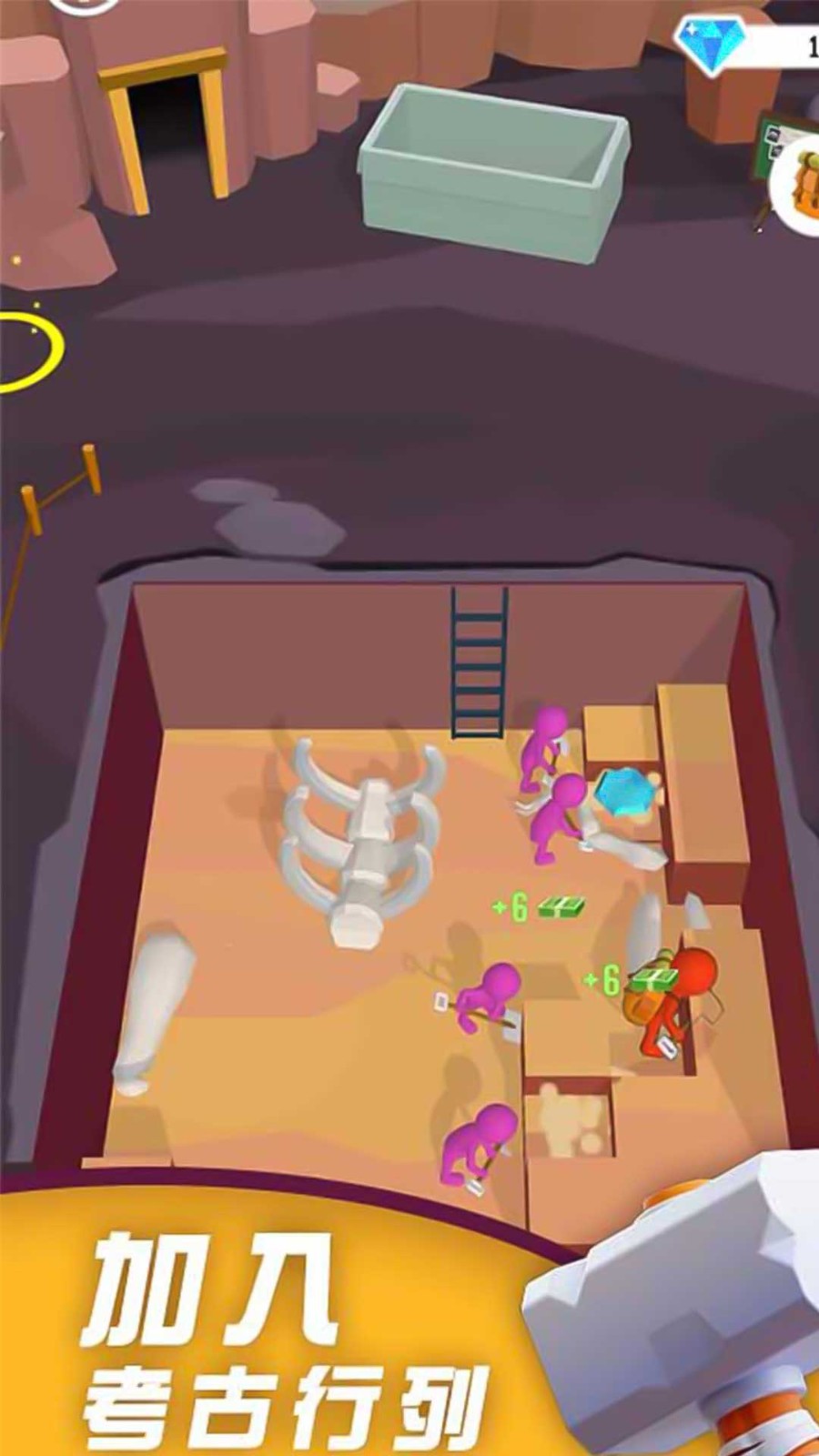 1、画面呈现考古场景,有角色、挖掘元素,玩家可体验考古挖掘等操作,属于模拟经营或冒险解谜类片段,展现独特的考古主题玩法场景。