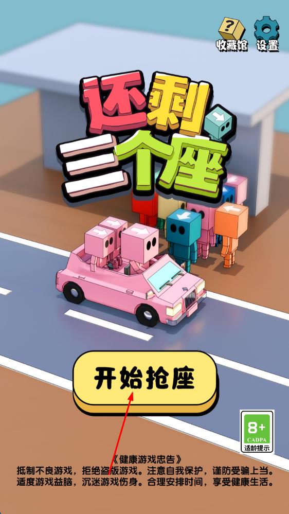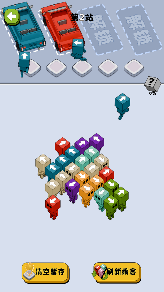 还剩三个座是一款轻松有趣的休闲益智解压游戏,玩家需让屏幕中的小人按头上箭头方向坐上对应颜色的车,当所有小人成功乘车离开即为胜利,简单玩法中暗藏策略挑战,是消磨时间的绝佳选择,感受将方块小人一个一个·送上车后胜利时的爽感。