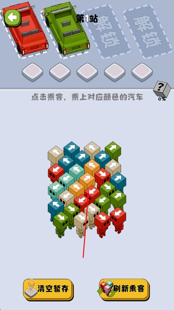 1、颜色匹配:根据车辆颜色点击对应颜色的小人,让其按箭头方向移动,精准匹配乘车目标。