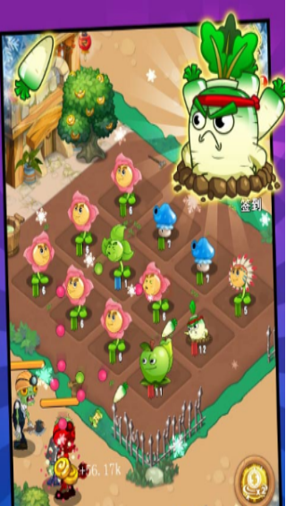 3、战斗时,用签到得的植物(如萝卜),补位/强化阵形,集火僵尸,借植物技能,守护阵地。