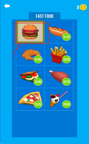 1、在商店界面查看各类快餐价格,红框标注的汉堡售价125美元,点击购买后金币余额将从0开始扣除。