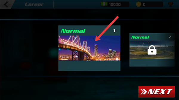 3、进入关卡选择界面,点击解锁的【Normal1】关卡(桥梁夜景图),开始首场摩托车竞速比赛。
