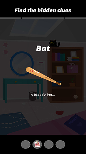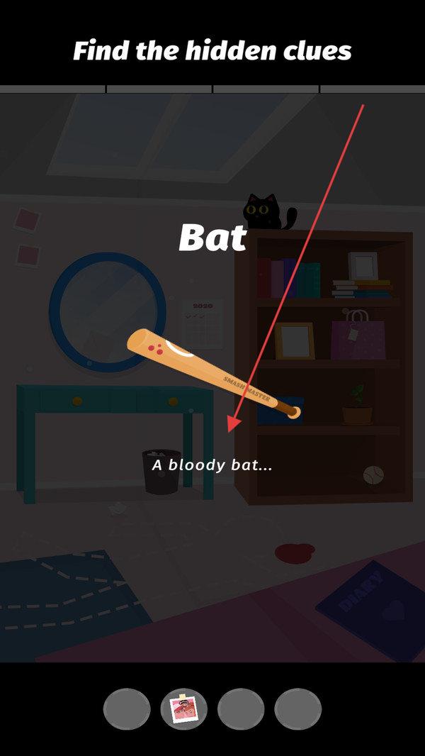 3、在房间场景,遵循【Find the hidden clues】指引,留意【带血球棒(Bat)】等物品,点击收集,为案件推理积累证据。