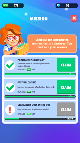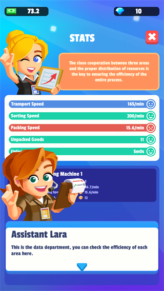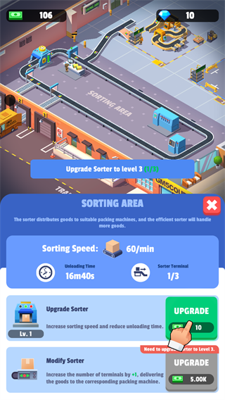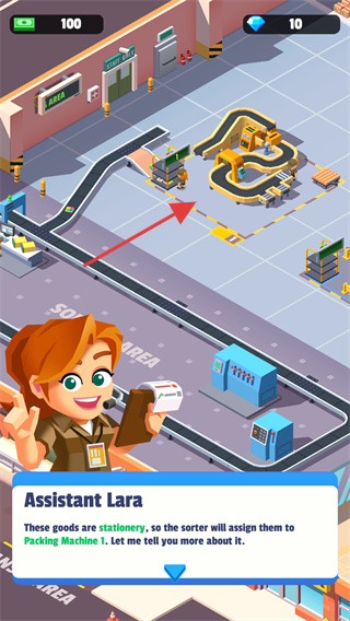 2、资源管理与升级策略:每日营收需分配至「购买材料」「升级设备」「雇佣员工」,前期优先升级「智能分拣机」提升打包速度,中期解锁无人机。