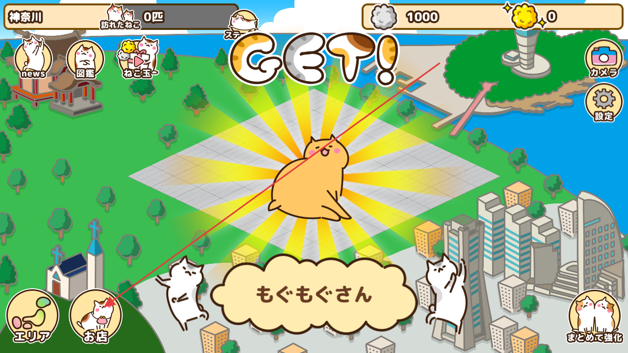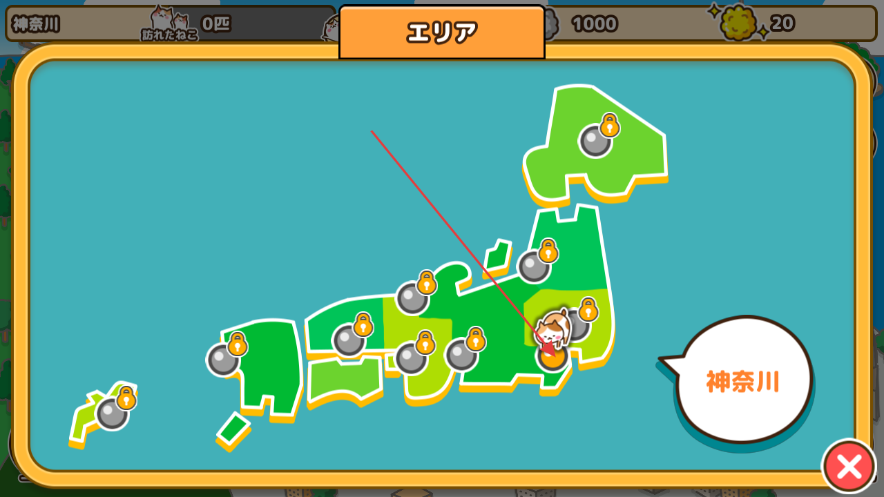 1、进入游戏,在地图(エリア)界面选择区域(如神奈川),探索解锁新场景,获取猫咪。