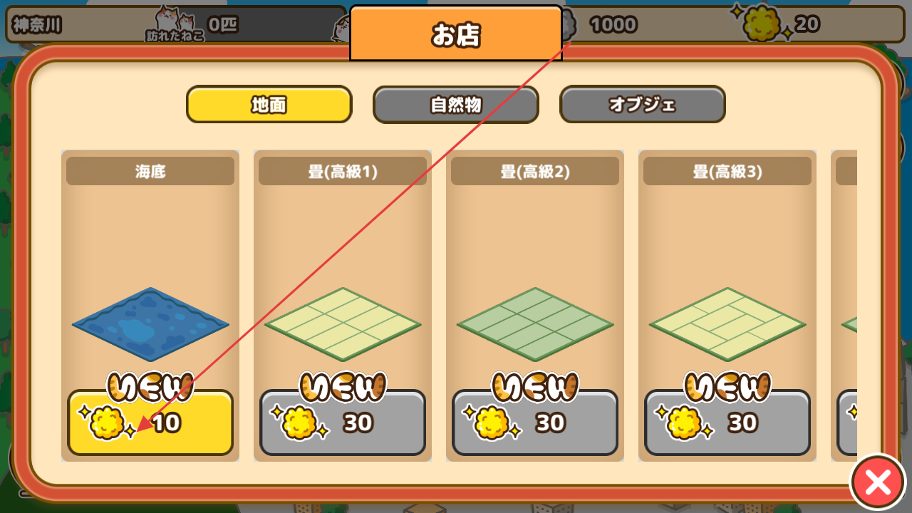 2、点击“お店”进入商店,消耗资源(如黄色爆炸物)购买地面、自然物等装饰,布置场景。