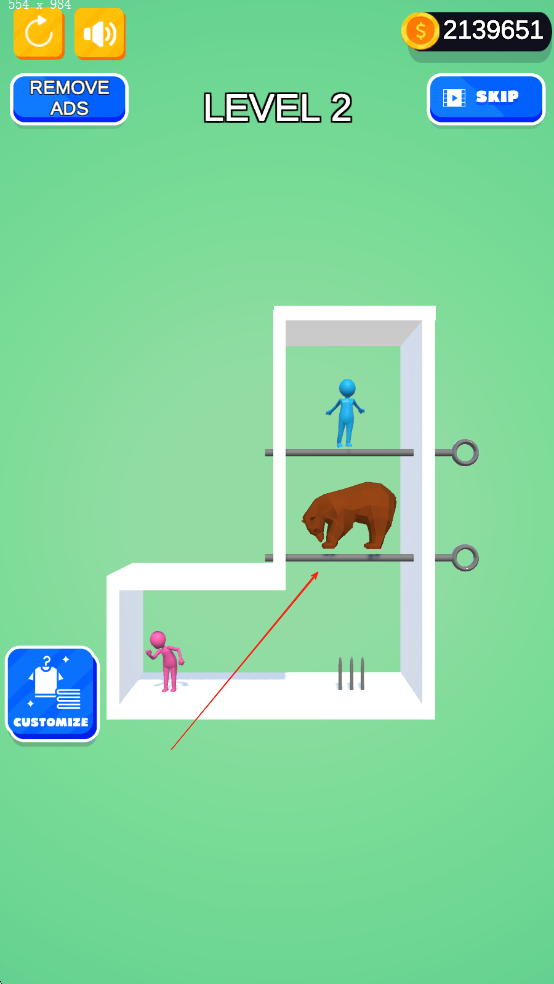 2、点击屏幕拉动销钉,引导小人沿安全路径移动,注意拉销时机避免触发陷阱或惊动野兽。