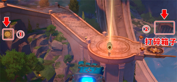 1、在场景找到带手掌标识机关,打碎指定箱子,激活晷灵残件追踪光线。