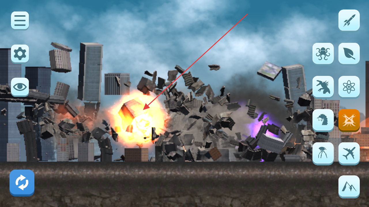 2、选定道具后,点击城市区域释放,触发对应效果(如爆炸、破坏建筑),体验粉碎城市过程。