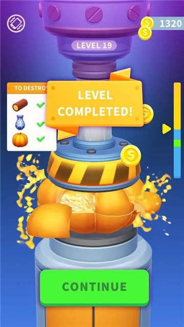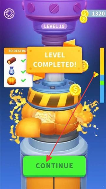 2、操作钻机下压,破坏指定物品,完成本关目标后,点击“CONTINUE”进入下一关。