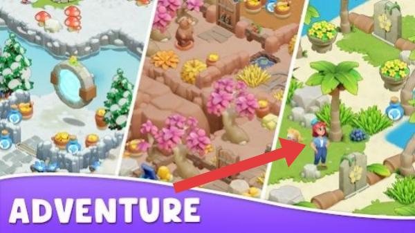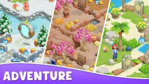 2、画面呈现了不同场景(雪景、花景、热带景)的冒险(ADVENTURE)元素,玩家可在这些场景中通过合并物品推进冒险进程。