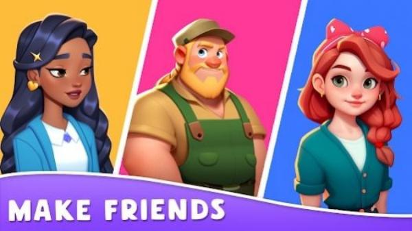 3、文字“MAKEFRIENDS”(交朋友)体现游戏社交元素,可在与这些角色互动交友,推进庄园经营等玩法。