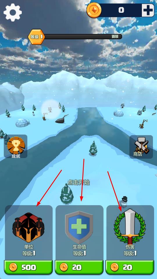 1、在关卡准备界面,消耗金币升级“单位、生命值、伤害”属性,强化防御、攻击能力,为抵御敌人进攻做战前提升。