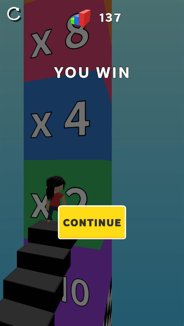 2、沿阶梯向上,通过倍数方块提升得分,抵达终点触发”YOUWIN”,点击“CONTINUE”进下一关。