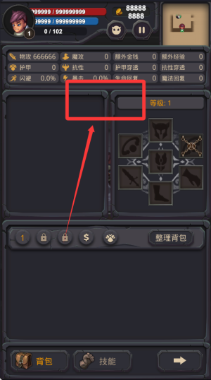 3、这是您的全属性面板,个人属性,金币,装备,背包功能集中,通关等等都是需要用到的。