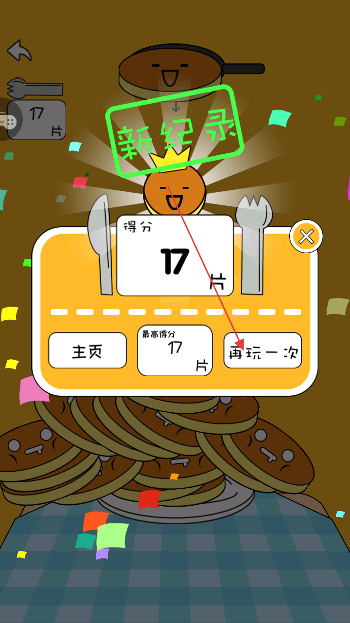 3、每轮结束显示得分,可点击“再玩一次”挑战新纪录,或通过“主页”切换模式、查看关卡,不断突破叠高成绩。