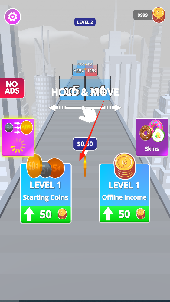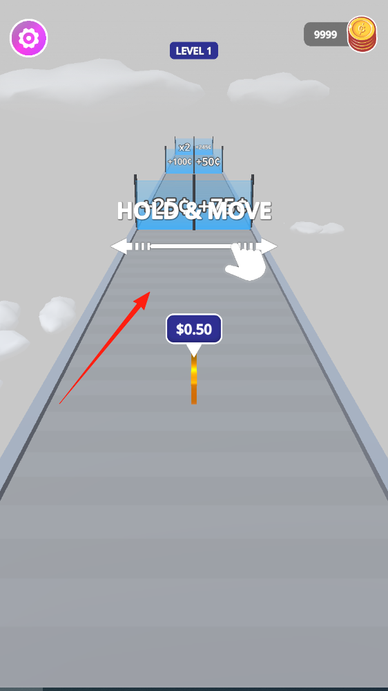 1、按住屏幕左右滑动,控制金币移动,通过增益区域,积累更多财富。