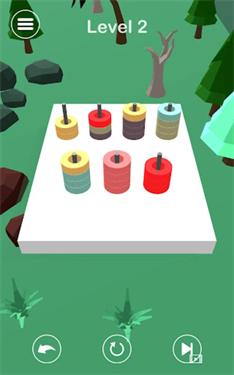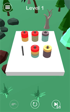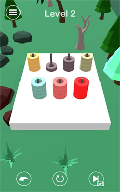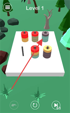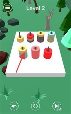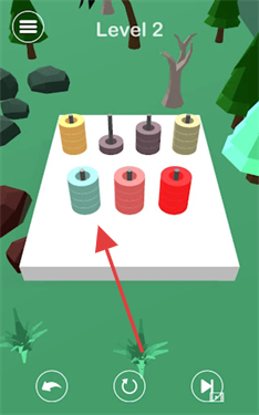 2、将圆柱移动到同色空缺位置,逐步整理,使每层圆柱颜色统一,完成关卡挑战。