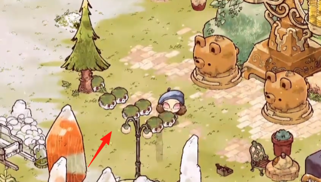 2、进入森林区域(红箭头),围绕路灯(果实),触发战斗,击败怪物,收集掉落(金币材料),解锁新地图。