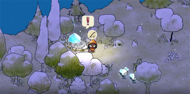 1、操控角色(红箭头),在雪地场景,靠近石头(带镐子标识),点击互动,采集资源,清理怪物(绿色果实),推进探索。